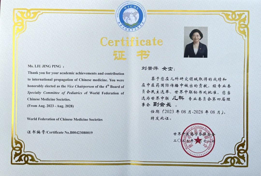 拉斯维加斯药业集团党委书记、董事长刘景萍当选世界中医药学会联合会儿科专业委员会第四届理事会副会长